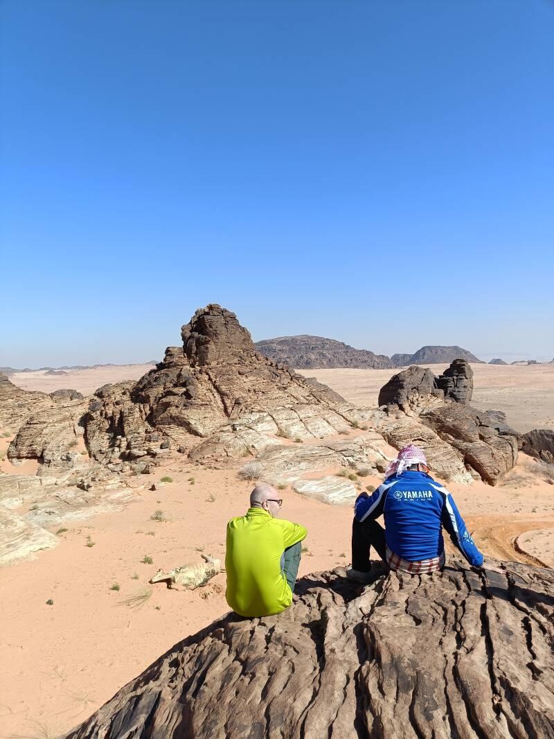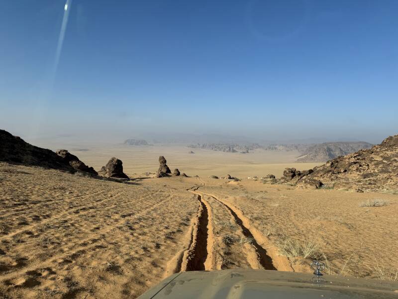 Il viaggio prosegue nel Nafud el Khebir, è un erg immenso, caratterizzato da grosse dune dette barcane con cespuglietti ovunque. Lo percorriamo rimanendo sulla larghe creste delle barcane ma ci accorgiamo che il paesaggio è sempre lo stesso quindi deviamo verso sud dove abbiamo individuato delle zone caratterizzate da pinnacoli e rocce di forma strane in pieno stile sahariano.