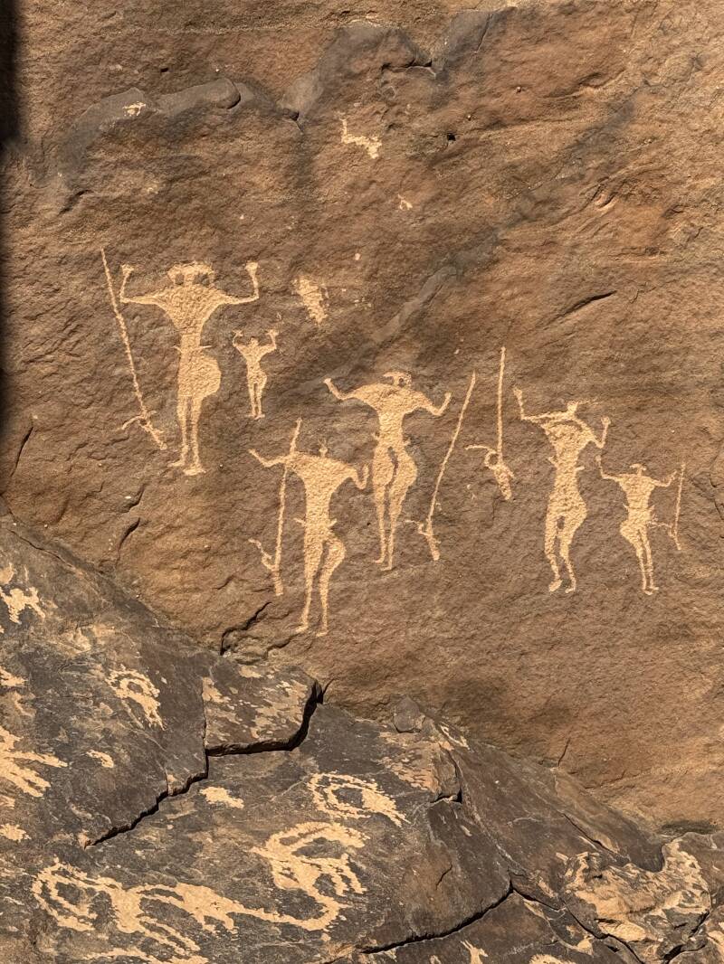 In questa zona troviamo incisioni repestri ovunque. Si trovano rappresentazioni umane insieme a bovini, stambecchi, orici, cervi, gazzelle, cavalli, ma anche leoni e struzzi. I cammelli sono probabilmente gli ultimi a popolare sia questa zona che le pareti delle rocce circostanti, rimaniamo estasiati e girelliamo tra le rocce per i giorni rimanenti.
